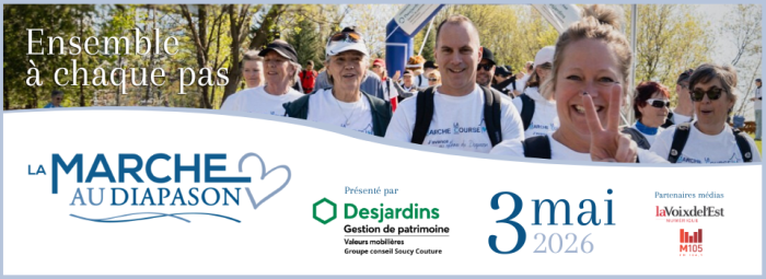 Bromont, le 17 février 2026 – Le 3 mai prochain, La Fondation Au Diapason tiendra la 17e édition de La Marche Au Diapason, présentée par le Groupe conseil Soucy Couture de Valeurs mobilières Desjardins. Cette rencontre annuelle, à la fois festive et porteuse de sens, réunira les communautés de Brome-Missisquoi et de la Haute-Yamaska dans les sentiers multifonctionnels de la ville de Bromont, où marcheurs et coureurs se mobiliseront pour soutenir les soins palliatifs et les services offerts par La Maison Au Diapason.